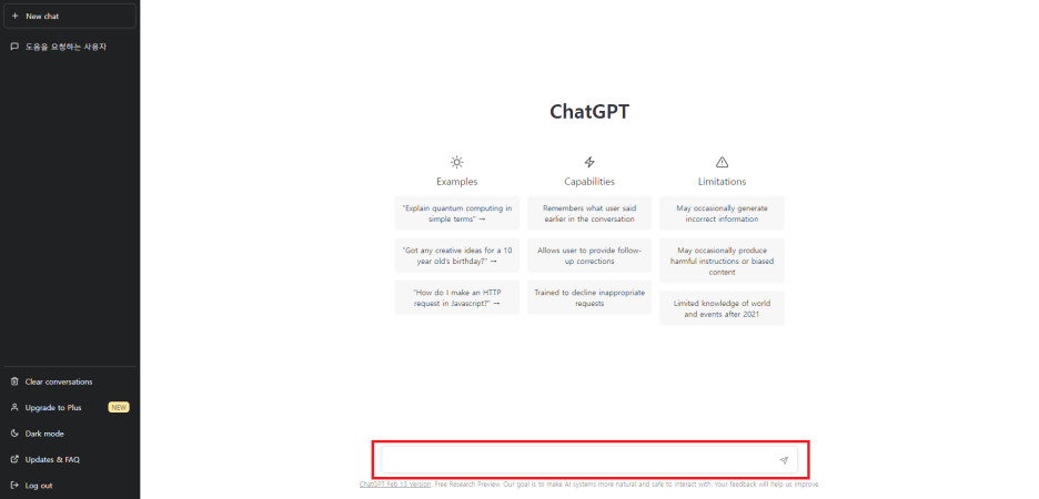 회원가입 후에는 위와 같은 화면을 보게 되실텐데, 아래 붉은 색으로 표시되어 있는 부분에 질문할 내용을 적고 대화를 시작하시면 됩니다. 어떤 질문을 할 수 있는지 예를 한 번 들어 볼까요?